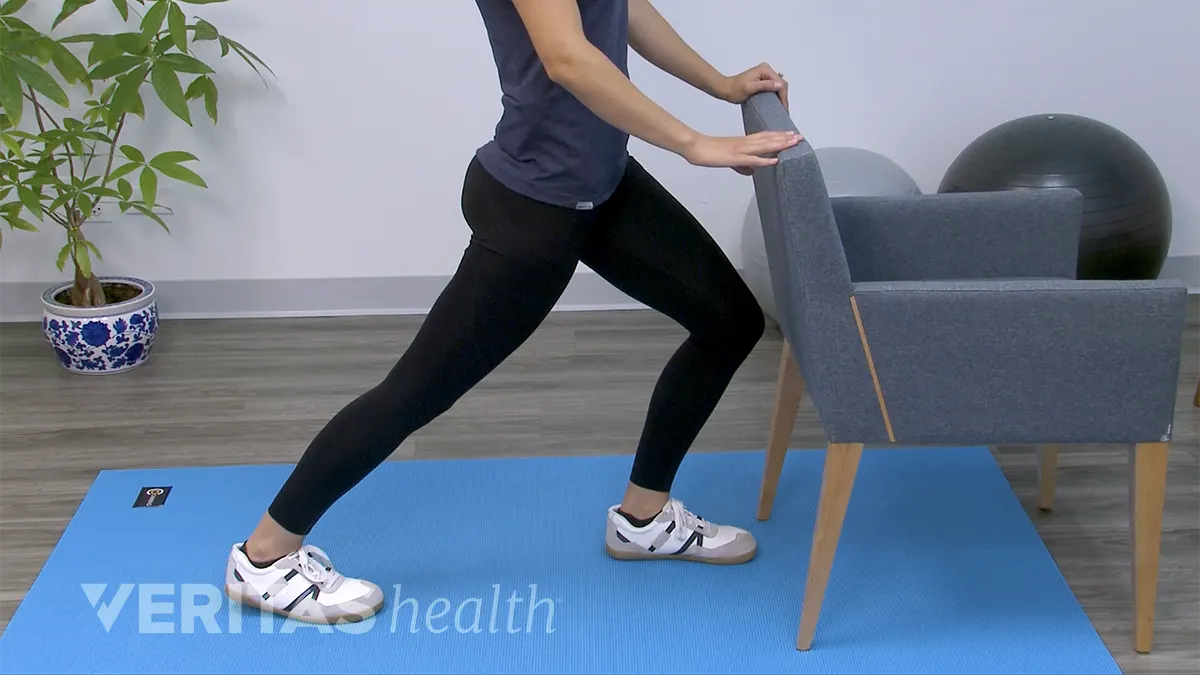 - Start position: Stand in front of a sturdy surface, such as a table or chair, and place both your hands on it for support.