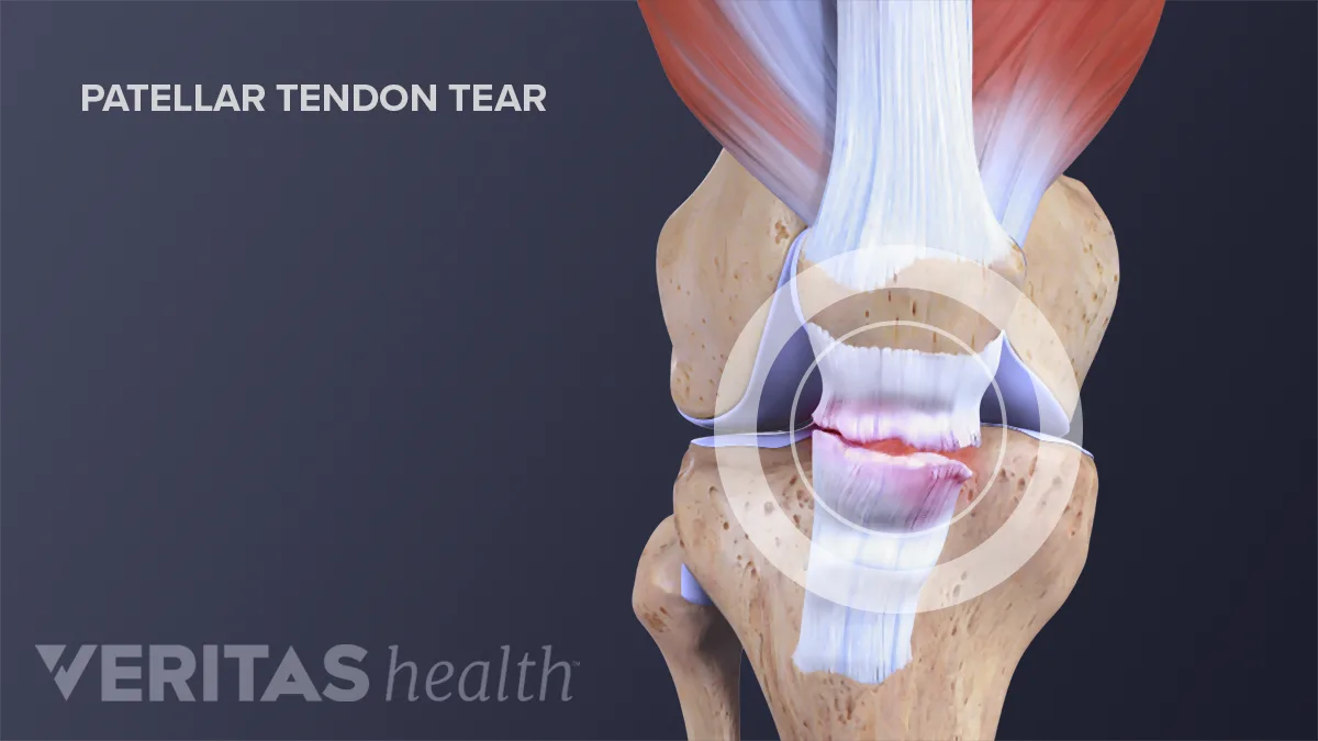 The patellar tendon connects the tibia (shin bone) to the quadricep muscles on the front of the thigh. This tendon can be torn where it attaches to the bottom of the kneecap—either partially or completely. If a small piece of the patella detaches along with the tendon, this is known as an avulsion fracture.